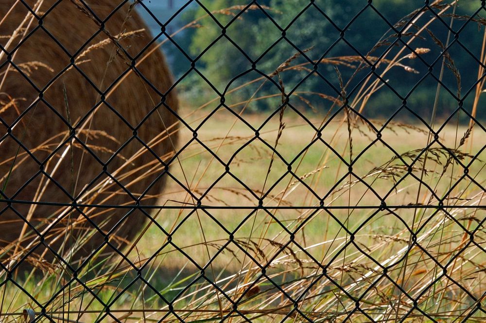 Heu in der Landschaft hinter einem Zaun zusammengerollt