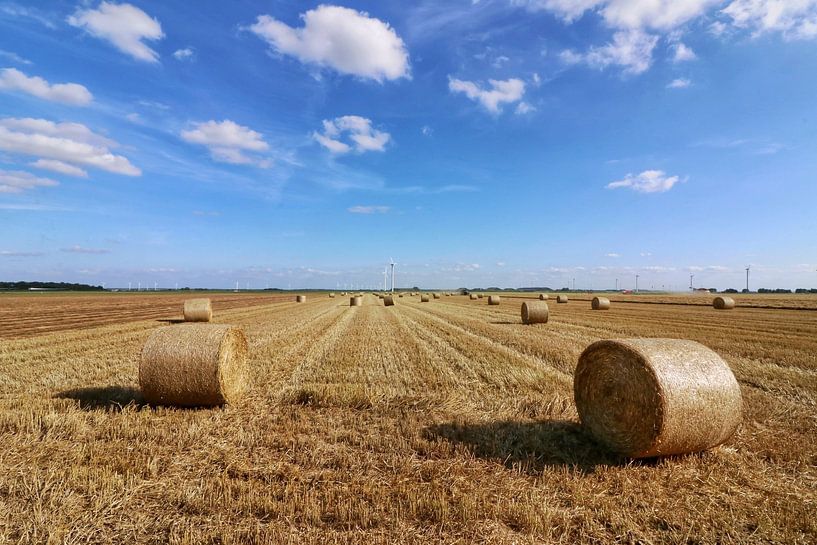 Heuballen im Flevopolder, mit Windrädern und Erntetraktoren im Hintergrund.