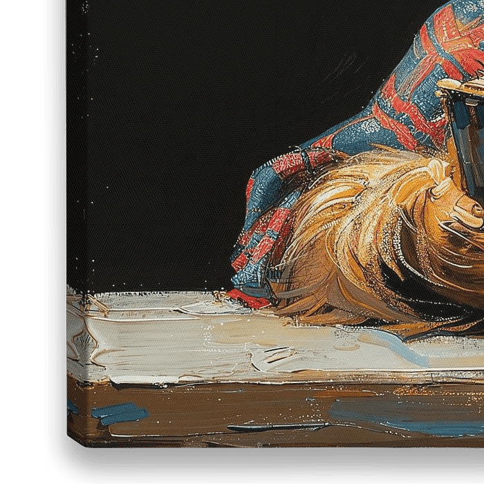 Ölgemälde einer anthropomorphen Hochlandkuh, die eine Brille trägt und in der Bibliothek ein Buch liest, mit einem niedlichen und glücklichen Ausdruck. Die Kuh hat flauschiges Fell und trägt ein buntes kariertes Hemd, sitzt auf einem Holztisch vor einem dunklen Hintergrund. Das Gemälde verfügt über eine detaillierte Textur und…