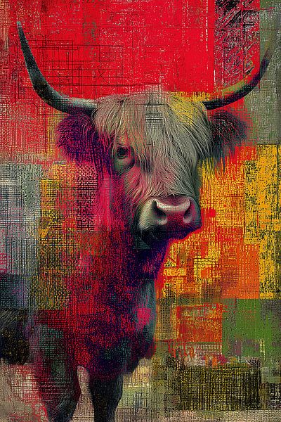 Dieser schottische Hochländer sieht mit seinen langen Hörnern und seinem eigenwilligen Pony, das lässig über einem Auge liegt, ziemlich cool aus. Aber statt nebliger Hügel ist er von einer Explosion aus Rot, Gelb und rauen Texturen umgeben.