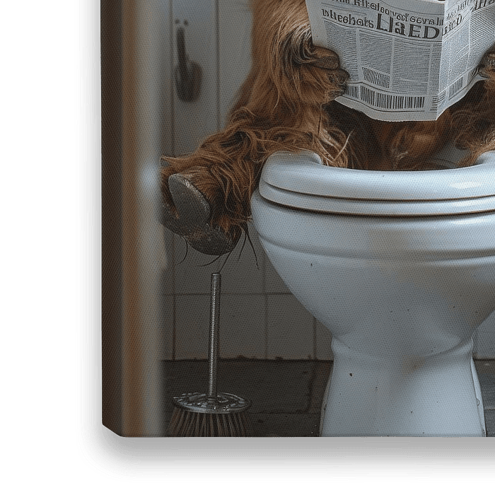 Lustiges Toilettenposter mit einer Highland-Kuh, die entspannt Zeitung liest. Perfekt für Badezimmerdekor.