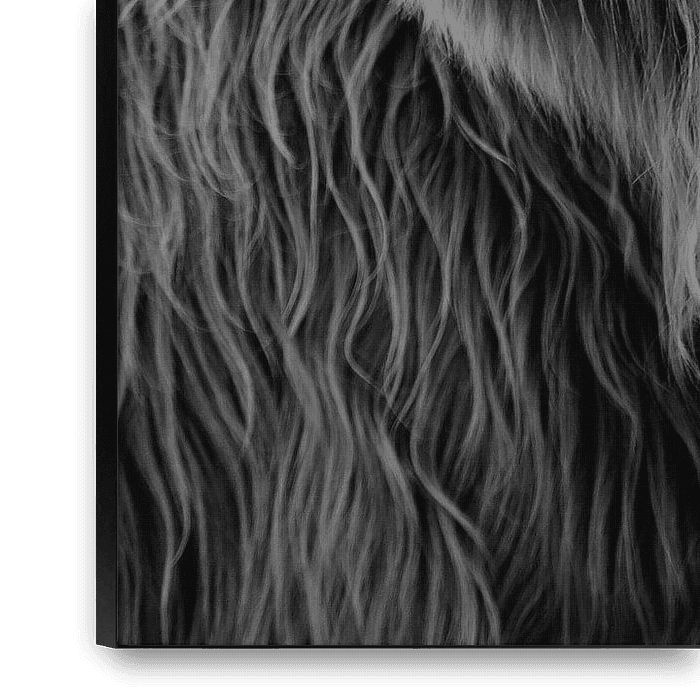 Bestelle dieses Schottische Hochlandrind Wandbild Highlander-Kuh sieht aufdringlich aus; in schwarz-weiß von Atelier Liesjes als Reproduktion auf Leinwand, Alu-Dibond, als Poster, Fototapete oder Acrylglasbild.