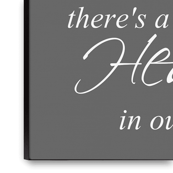 Weil jemand, den wir lieben, im Himmel ist. Die Hintergrundfarbe ist dunkelgrau, die Buchstaben sind weiß. Text auf Leinwand oder anderem Material.