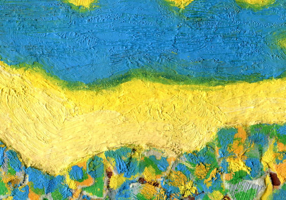 Kunstwerk einer blauen Wolke, die in einem gelben Himmel über einer farbigen, bergigen Landschaft schwebt.