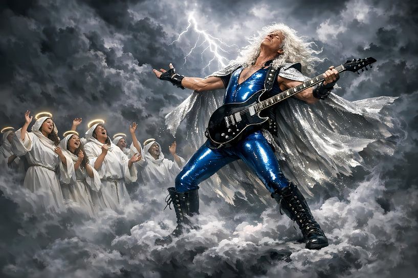 Ein harter Rockgitarrist lebt seine Musik aus, enthusiastisch unterstützt von einem swingenden Engelschor, umgeben von bedrohlichen Wolken und einem Blitz.