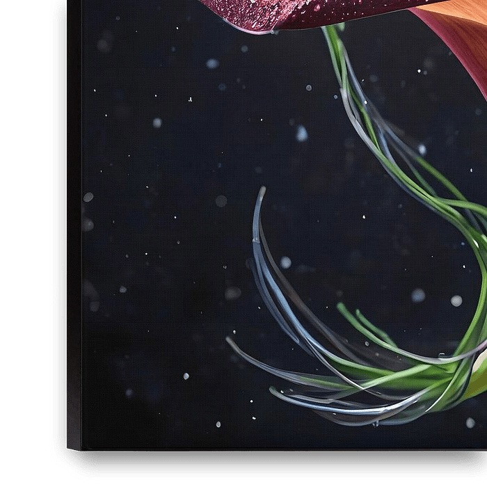 Tauchen Sie ein in die zauberhafte Welt von "Heavenly Lily", einem digitalen Kunstwerk, das die Grenzen der Vorstellungskraft sprengt. Diese atemberaubende Kreation zeigt eine majestätische rot-violette Lilie mit zarten gelb-orangenen Akzenten, die frei in der unendlichen Weite des Raums schwebt. Der spiralförmige Stängel, der…