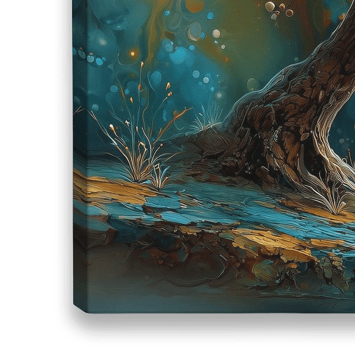 Dieses Fantasiegemälde zeigt eine bezaubernde Szene mit einem anmutigen Blütenbaum, der sich elegant über ein schimmerndes Gewässer beugt. Seine Äste sind reich mit weißen Blüten geschmückt, die von innen heraus zu leuchten scheinen und in ein magisches Licht aus Gold, Türkis und Tiefblau getaucht sind. Der Hintergrund scheint sich wie…