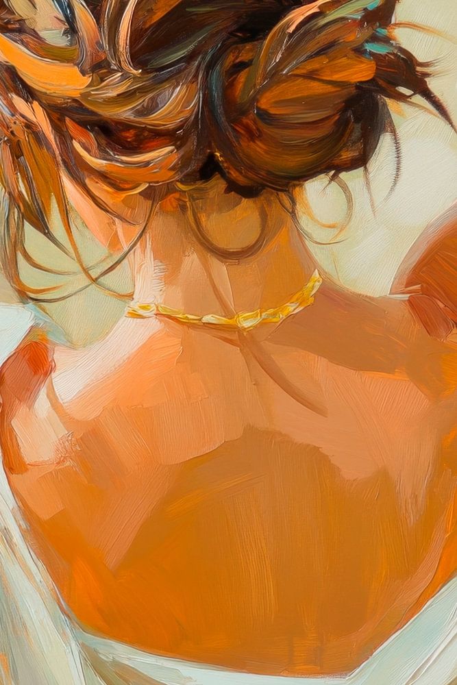 Eine sanfte Eleganz durchflutet die Szene, während zarte Strähnen im Haar spielerisch zur Geltung kommen. Die geschwungene Silhouette und der fließende Stoff verleihen der Komposition eine beinahe traumhafte Leichtigkeit. Ein Hauch von Intimität umhüllt die Atmosphäre, während subtile Farbnuancen die Sinnlichkeit betonen und die Betrachter_innen in eine Welt voller Anmut entführen.