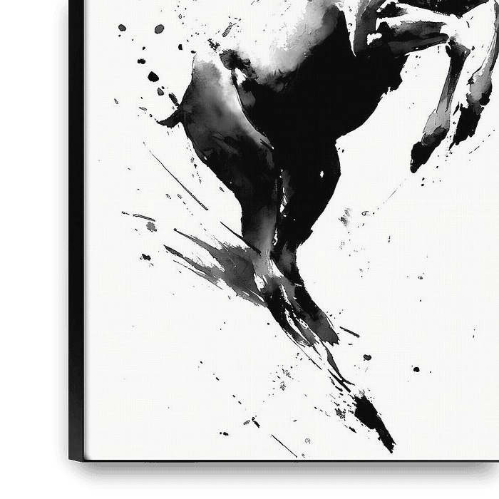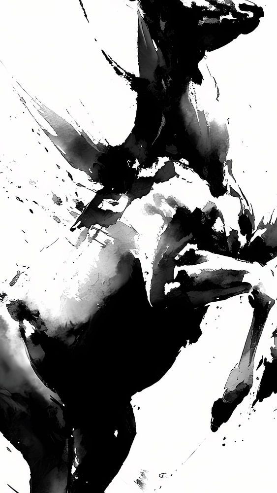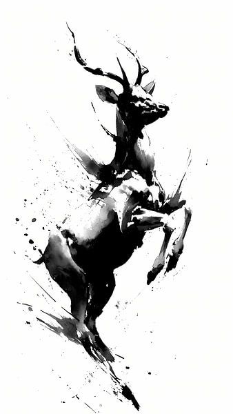 Das Reh wird in einem Sprung eingefangen – ein Moment, der von Instinkt und Präzision geprägt ist. Trotz der Spannung in der Luft bewegt sich sein Körper elegant vorwärts. Die sich auflösende Tinte unter seinen Beinen suggeriert Zerbrechlichkeit, aber auch unaufhaltsame Dynamik. Es ist kein Raubtier zu sehen, doch Wachsamkeit prägt…