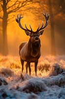 Im goldenen Licht der Dämmerung steht ein majestätischer Hirsch, dessen imposante Geweihe stolz in die Höhe ragen. Der sanfte Nebel umhüllt ihn, während der Frost das Gras glitzern lässt. Seine Augen scheinen die Stille des Waldes zu bewahren, ein stiller Wächter in einem zauberhaften Moment der Natur.