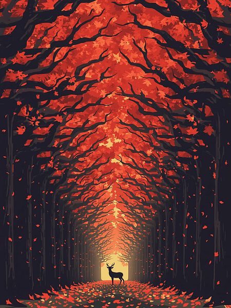 Bestelle diese Illustration Hirsch im roten Baum von Giandra Safaraz als Reproduktion auf Leinwand, Alu-Dibond, als Poster, Fototapete oder Acrylglasbild.