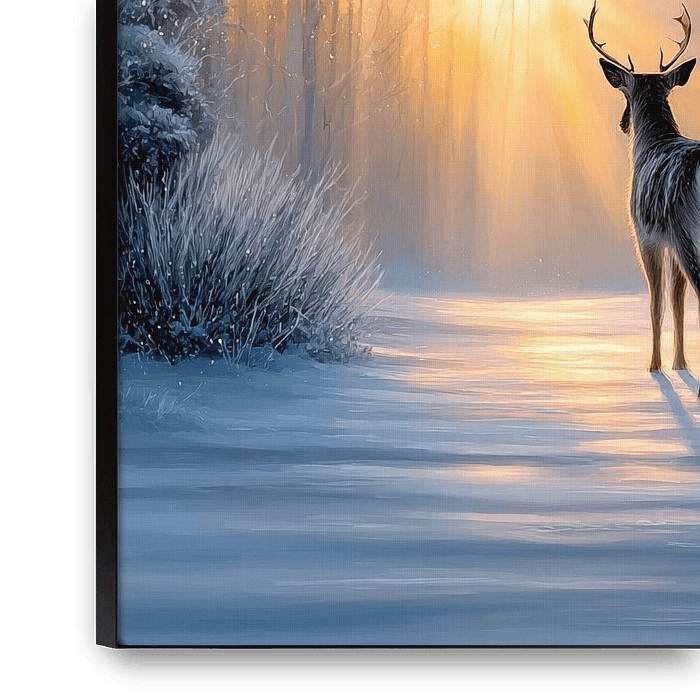 Winterbild eines Rehs im Wald bei Sonnenaufgang, warme Töne, die Sonne scheint im Hintergrund zwischen den verschneiten Ästen der Kiefern.