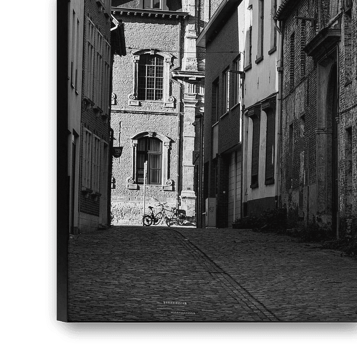 Blick auf eine alte Seitenstraße im Stadtzentrum von Aalst, Ostflandern, Belgien: 'Stoofstraat'. Die alten Arbeiterhäuser und ein Tor aus dem 18. Jahrhundert säumen die Straße, die bergauf zum St.-Josephs-Kolleg und seiner schönen Fassade aus dem 18. Jahrhundert führt. Schwarz-Weiß-Architektur- und Reisefotografie, die ein tolles Souvenir für Ihre Wand ist.
