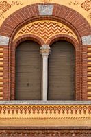 Eine stimmungsvolle Nahaufnahme eines ungewöhnlichen Fassadendetails in Como, Italien: zwei Rundbogenfenster mit geschlossenen Fensterläden, umrahmt von rötlich-braunem Backstein und sandfarbenem Putz mit geometrischen Mustern.