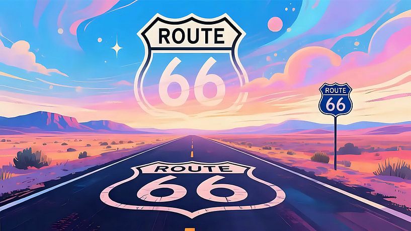 Die Aufnahme zeigt einen Abschnitt der historischen Route 66 in sachlicher Darstellung: eine zweispurige, asphaltierte Landstraße mit klarer, weißer Mittellinie und abgesetzten Randmarkierungen, die sich schnurgerade in die Ferne zieht. Rechts und links erstrecken sich flache, trockene Ebenen mit niedriger Vegetation, vereinzelten…