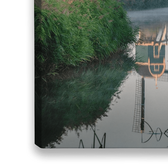 Entlang des Wassers wächst ein voller Schilfgürtel. An diesem frühen Morgen ist es fast windstill. Dadurch spiegelt sich die Mühle schön im Wasser.