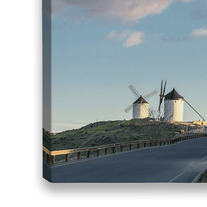 Alte Windmühlen auf der historischen Route der Mühlen von Cervantes (Don Quijote), in La Mancha (Spanien), in einer Landschaft bei Sonnenuntergang.