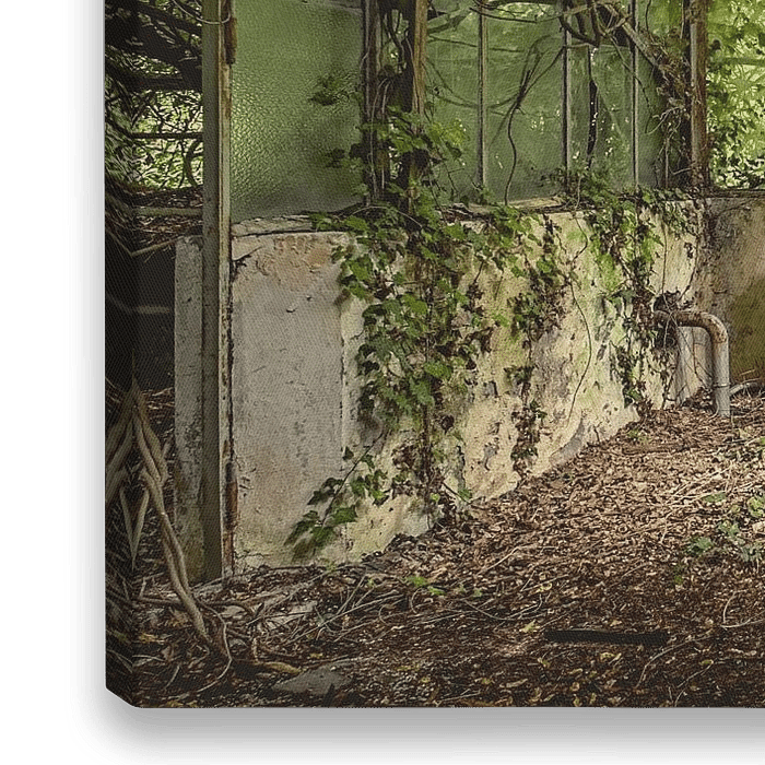 Ein verlassenes Gewächshaus in einem Park in einer italienischen Stadt. Das Gewächshaus ist durch die Vegetation, die an den Glasfassaden und dem Dach emporwächst, fast unsichtbar. Durch die teilweisen Buntglasfenster fällt immer noch schönes Licht ein.