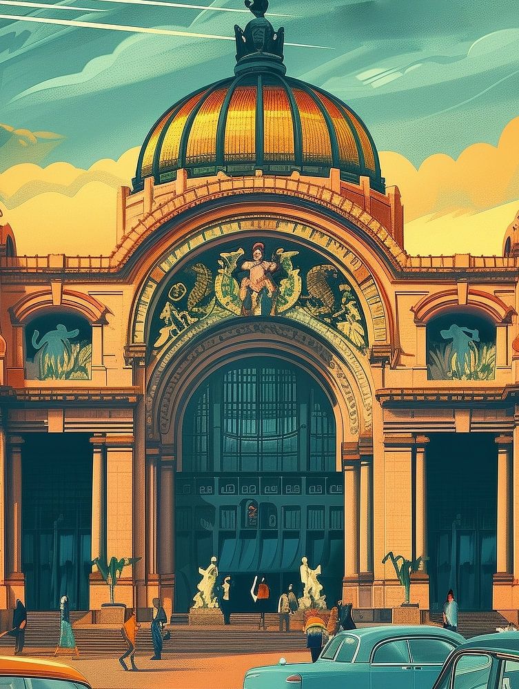 Dieses Reiseplakat für Mexiko-Stadt fängt die pulsierende Seele und Geschichte der größten Metropole Lateinamerikas ein. Im Mittelpunkt steht der elegante Palacio de Bellas Artes, eingerahmt von Oldtimern, die auf schattigen Boulevards unter einem Himmel voller Sonne und sanfter Wolken fahren. Palmen und charmante Menschenmassen erinnern an die lebendige Kultur der Stadt und an die zeitlose Schönheit ihres architektonischen Erbes. Dieses Kunstwerk ist perfekt für Liebhaber mexikanischer Reiseziele, urbaner Kultur und Retro-Design. Es führt den Betrachter in die farbenfrohen Straßen, den künstlerischen Geist und die reichen Traditionen ein, die Mexiko-Stadt zu einem beliebten globalen Knotenpunkt gemacht haben. Die harmonische Mischung aus Architektur, Stadtleben und kultureller Lebendigkeit macht diesen Druck zu einer idealen Wahl für die Dekoration von Cafés, Studios, Wohnzimmern oder Büros. Wecken Sie Inspiration und Fernweh mit einem Wandkunstwerk, das die dynamische Essenz, die herzliche Gastfreundschaft und die geschichtsträchtige Vergangenheit von Mexiko-Stadt widerspiegelt.