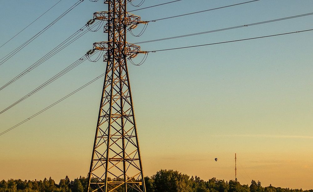 Ein filigraner Hochspannungsmast spannt Leitungen über das goldene Feld, die das Auge zur Horizontlinie führen. Himmelsblau trifft auf warme Erdtöne – ein klares, grafisches Bild zwischen Technik und Natur.