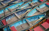 Hölzerne Ruderboote (Punters) in Oxford. England Oxfordshire. Von oben betrachtet.