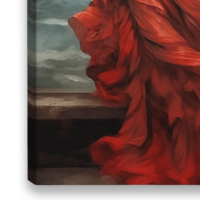 Klassisches Gemälde, das das Porträt einer Frau in rotem Kleid am stürmischen Meer zeigt.