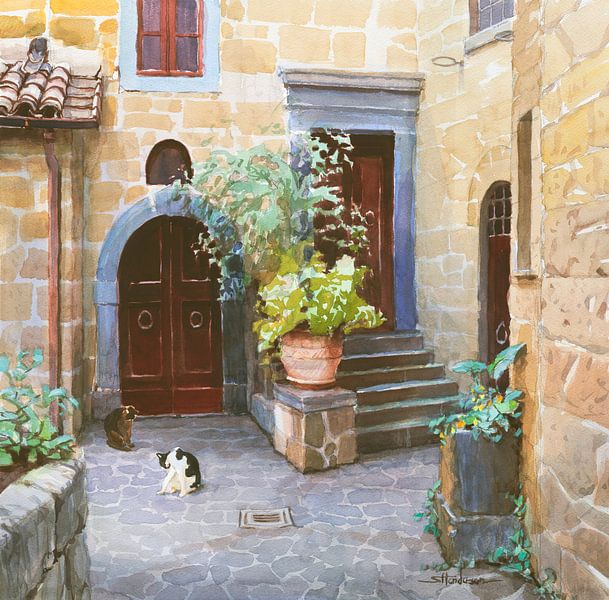 Bestelle diese Malerei Hofkatzen von Steve Henderson als Reproduktion auf Leinwand, Alu-Dibond, als Poster, Fototapete oder Acrylglasbild.