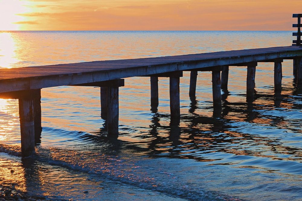 Holzsteg am Meer bei Sonnenuntergang