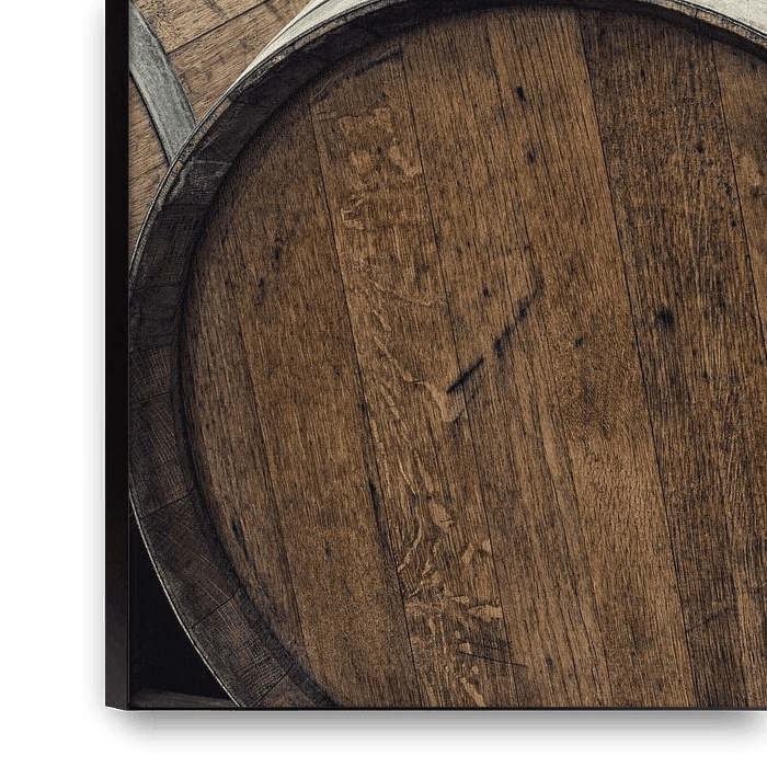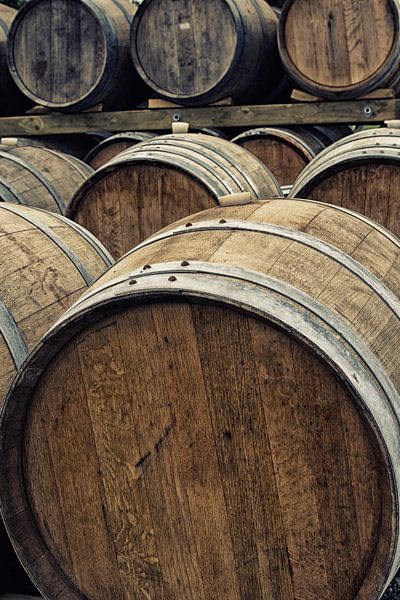 Gestapelte Holzweinfässer in einer Weinkellerei.