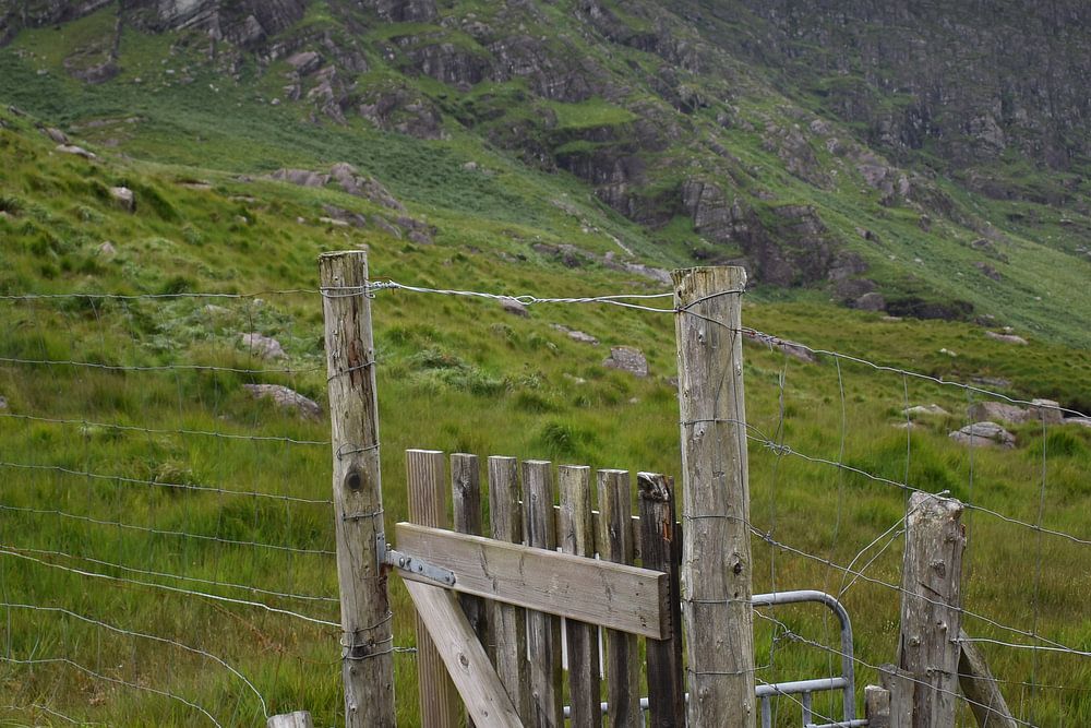 Hölzernes Eingangstor zu einer Wiese voller Schafe an einem See in den Bergen von Irland.