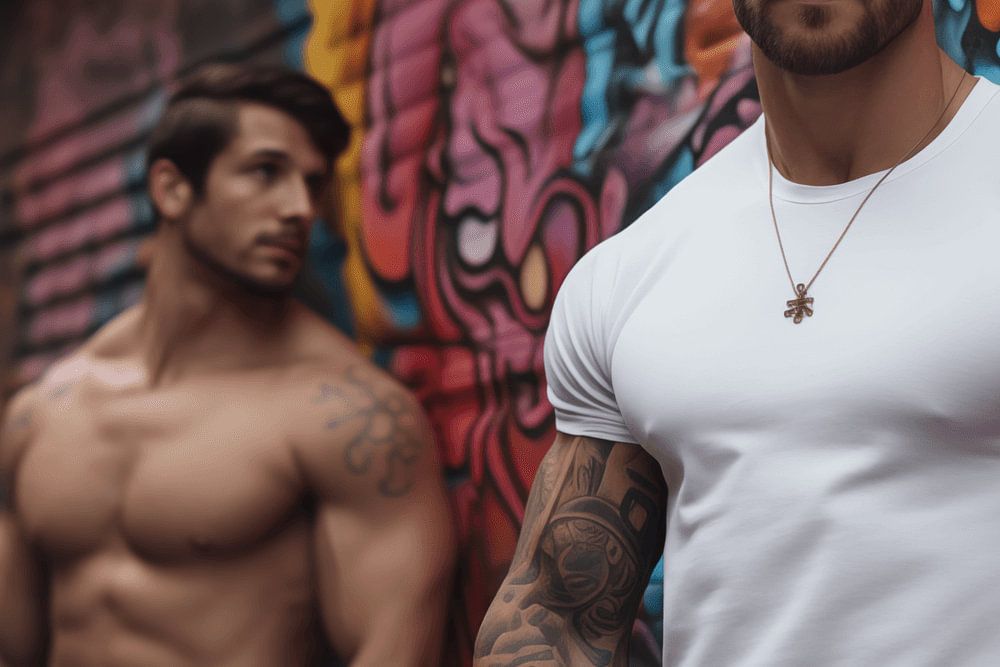 Die Komposition ist kraftvoll und strahlt Selbstvertrauen aus. Jeder Mann hat seinen eigenen, einzigartigen Look: von intensiven Blicken und angespannten Muskeln bis hin zu einer lässigen Haltung, die die innere Stärke unterstreicht. Die Beleuchtung spielt eine entscheidende Rolle, denn die Schatten heben die Konturen der Körper hervor und bringen die Textur der Graffiti wunderbar zur Geltung. Das Farbspektrum reicht von leuchtenden, kräftigen Tönen bis zu subtilen, fast poetischen Schattierungen, die dem Ganzen ein Gefühl von Bewegung und Leben verleihen.