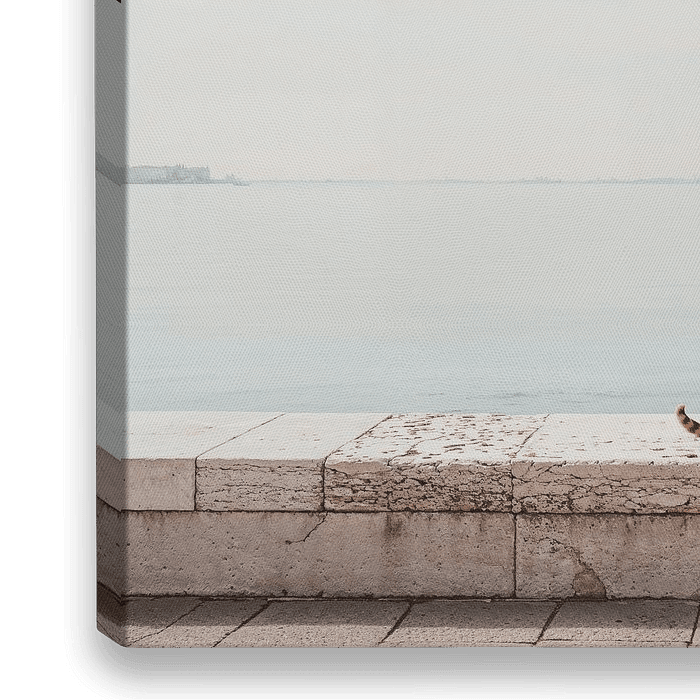 Eine rote Katze, umgeben von mediterraner Atmosphäre, genießt die Sonne und blickt über das ruhige Meer bis zum Horizont. Dieses Kunstwerk strahlt Ruhe, Konzentration und ein Gefühl der Hoffnung aus.