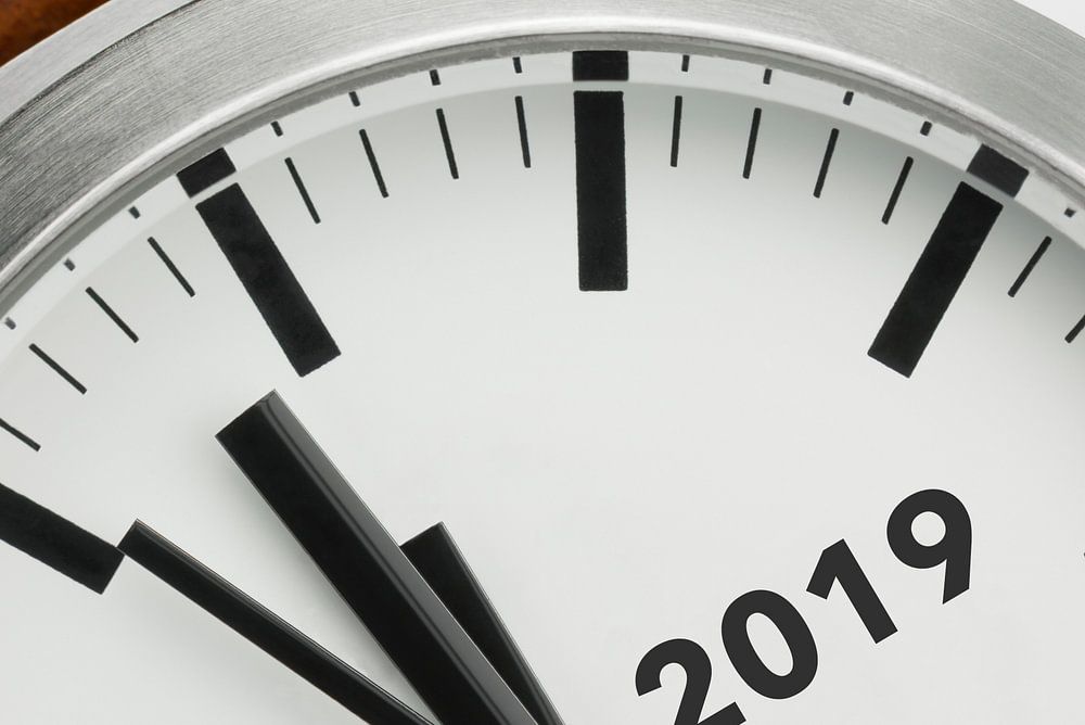 Analoog horloge met conceptuele visualisatie van de jaarwisseling 2018 2019