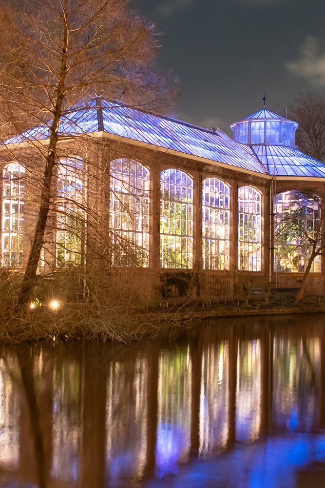 Schöne nächtliche Reflexionen des Hortus Botanicus Amsterdam . Der Garten liegt in der Nachbarschaft der Plantage. Der Garten ist etwa 1,2 ha groß und enthält mehr als sechstausend tropische und einheimische Bäume und Pflanzen. Das monumentale Palmengewächshaus stammt aus dem Jahr 1912.