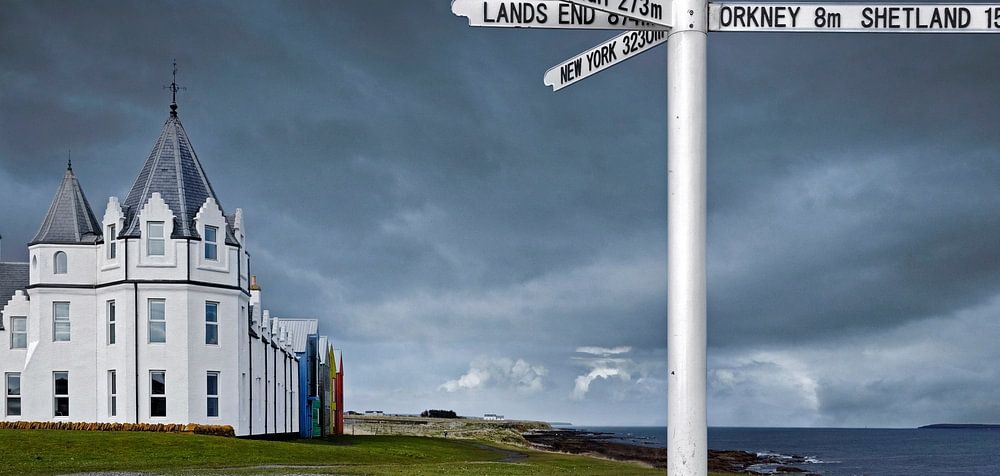 Hotel und Entfernungsangaben im Hotel John O'Groats Schottland. Starker Regenschauer. Post mit Entfernungsangaben zu den Shetland- und Orkney-Inseln. Schottisches Hochland.