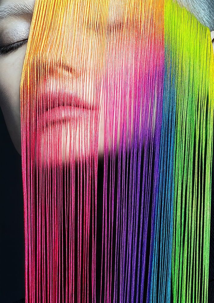 Die schimmernden Regenbogenfäden, die das Gesicht wie ein Vorhang umhüllen, symbolisieren sowohl die Zartheit als auch die Komplexität von Identität.