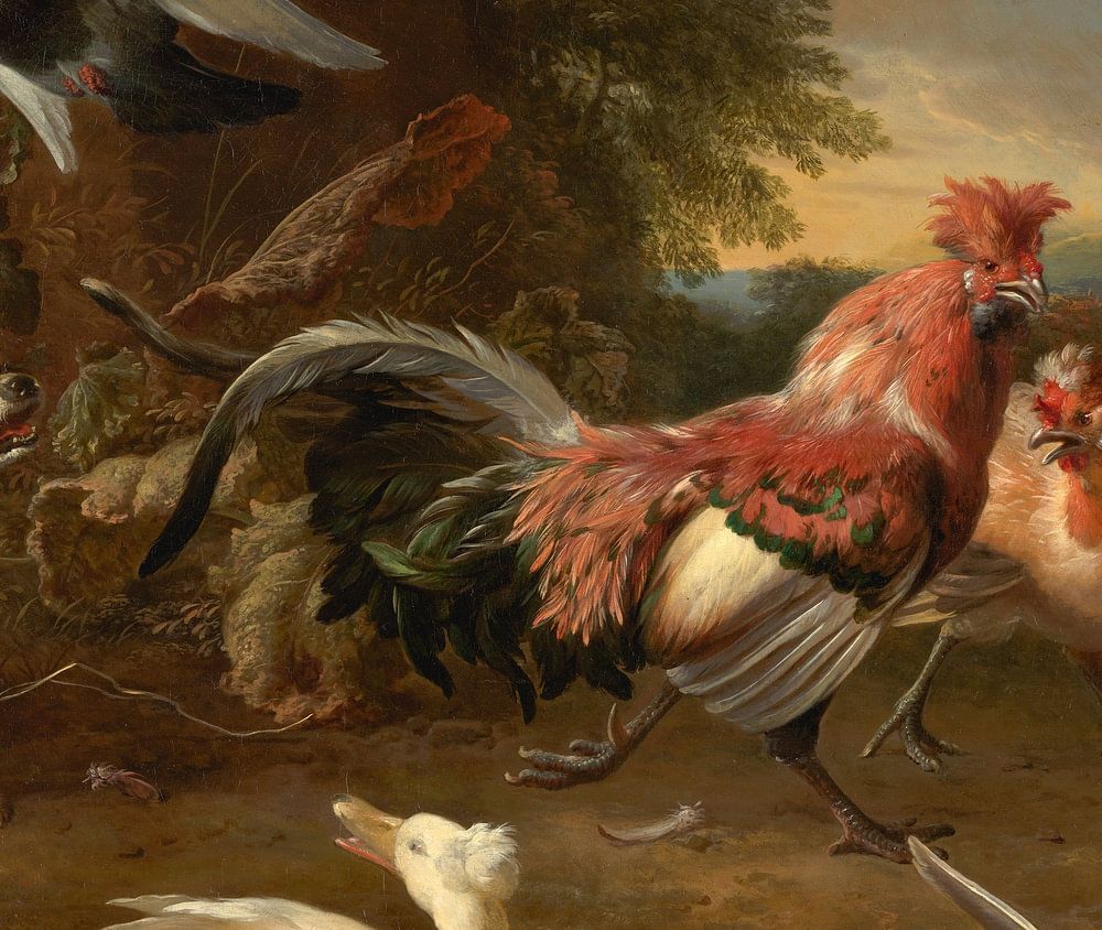 Hondecoeter war ein Spezialist für das Malen von Geflügel. Hier werden die Vögel von einem bellenden Hund erschreckt, der links auftaucht. Ein bunter Hahn tritt auf hohen Beinen weg, die weiße Ente schützt ihre Hühner, eine Taube fliegt hastig.