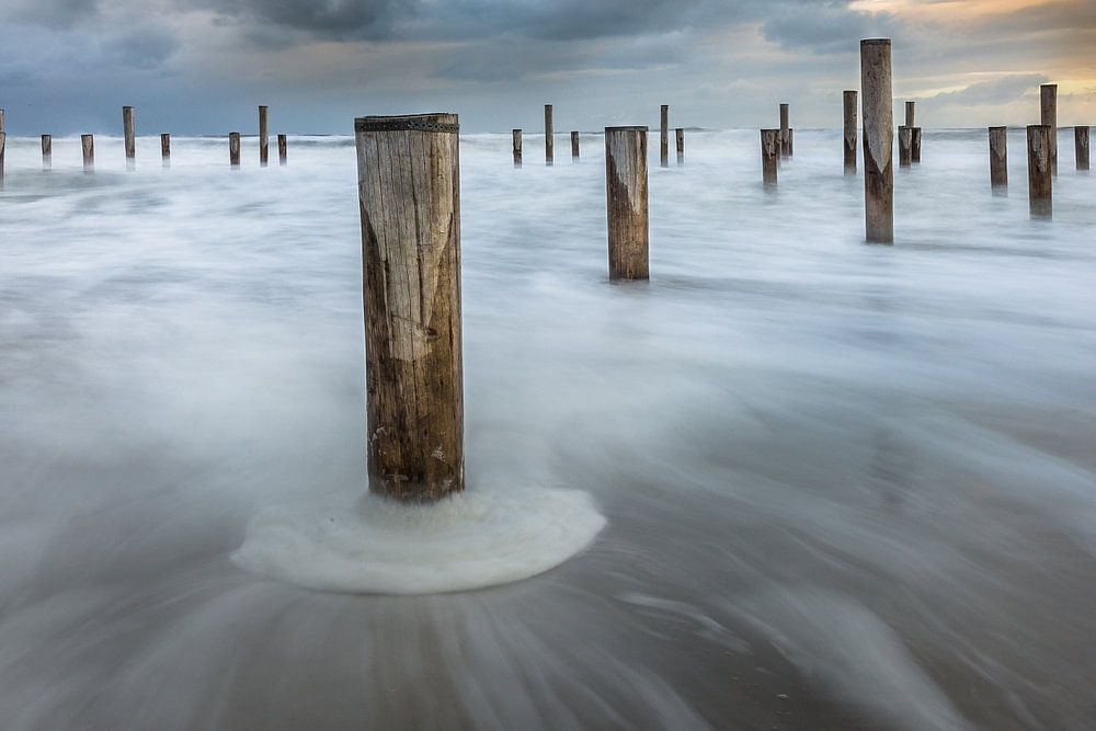 In Petten gibt es Pfähle im Meer, als Denkmal für ein Dorf, das im 19. Jahrhundert im Meer versank. Die Stangen sind auch ein schönes Projekt, das in dieser Atmosphäre zu fixieren ist.