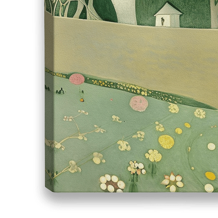 Ein kleines Haus inmitten eines Feldes, das in sanfte Pastellfarben gehüllt ist. Die Bäume, die das Haus umgeben, haben eigenartige Formen und Farben. Die ganze Szene hat eine verträumte Atmosphäre, in der die Kombination aus dem hübschen Häuschen, den seltsamen Bäumen und den bunten Blumen eine bezaubernde Landschaft bildet. Es scheint…