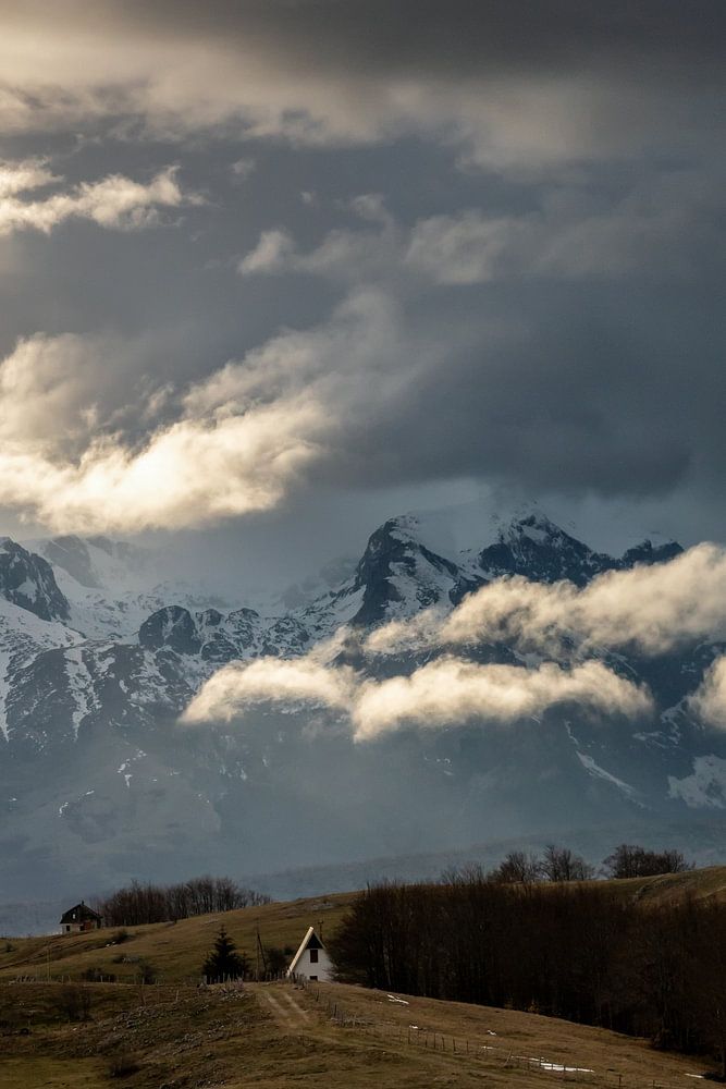 Eine kleine Hütte in den Bergen von Montenegro unter einem dramatischen Himmel
