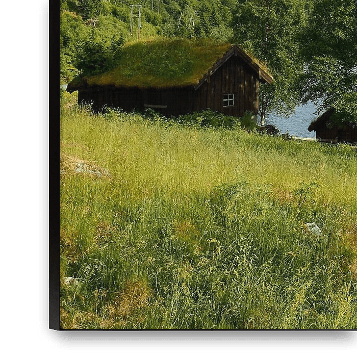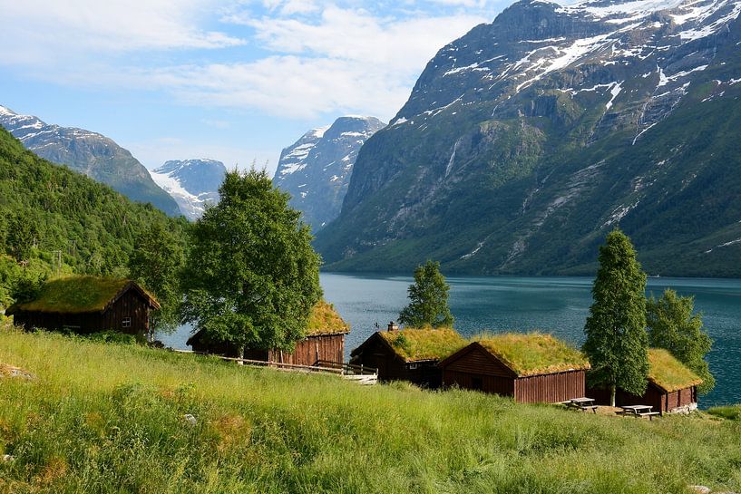 Grasbewachsene Hütten am Lovatnet in Norwegen