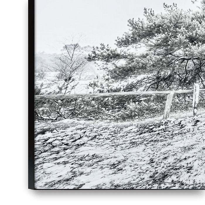 Bestelle dieses Landschafts-Wandbild Hulshorster Sand im Schnee von Eddy Westdijk als Reproduktion auf Leinwand, Alu-Dibond, als Poster, Fototapete oder Acrylglasbild.