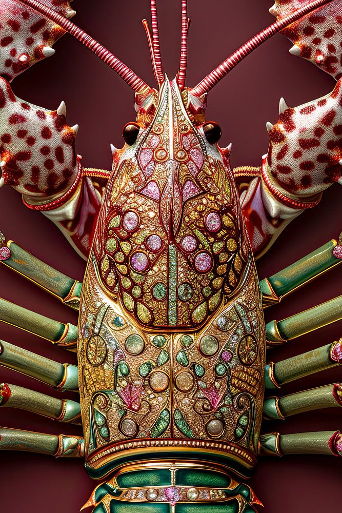 Schöner luxuriöser Hummer mit Edelsteinen und Pantherdruck für seine rosa Scheren verziert. Auf einem burgunderroten Hintergrund.