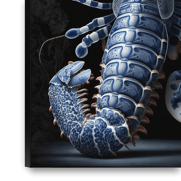 Bestelle das digitale Kunst Bild Hummer luxe - Delfter Hummer blau - Klassisch modern von Marianne Ottemann - OTTI als Reproduktion auf Leinwand, Alu-Dibond, als Poster, Fototapete oder Acrylglasbild.