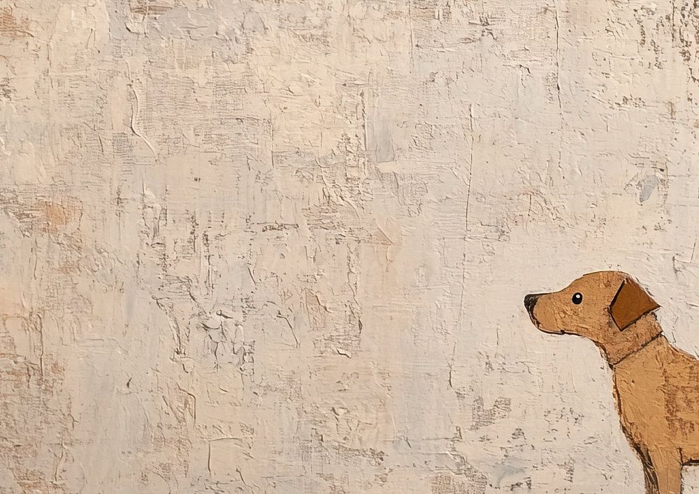 Hund | Hund auf Erdtönen - Dieses Gemälde zeigt einen niedlichen Hund, der mit neugierigem Blick nach links schaut, vor einem Hintergrund in Erdtönen von Beige und Off-White, typisch für moderne abstrakte Kunst.