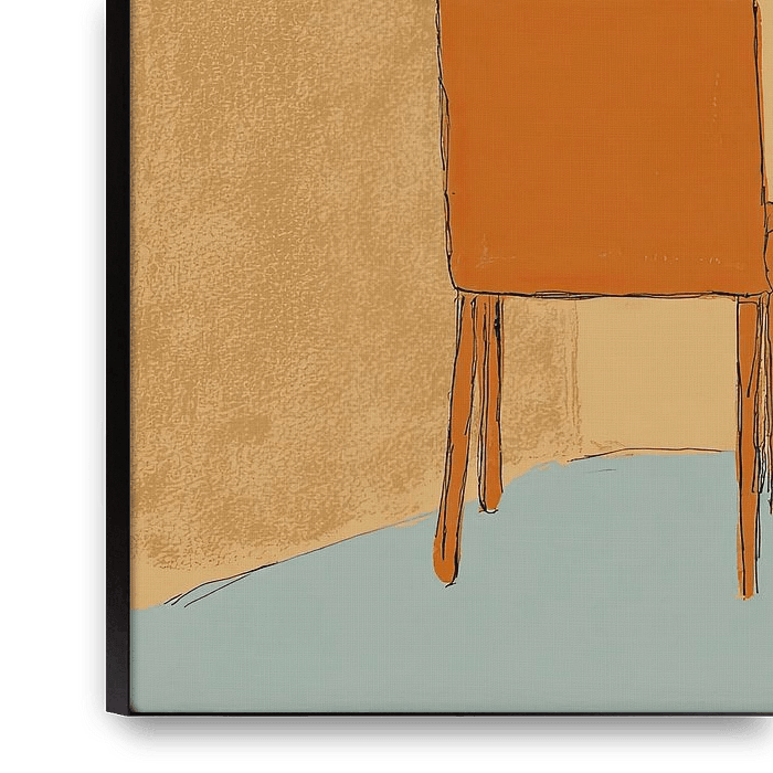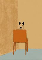 Diese minimalistische Illustration zeigt einen hellen Hund mit markanten schwarzen Ohren und einer schwarzen Nase, der hinter einem orangefarbenen Stuhl sitzt. Der Stuhl steht zentral im Bild und zeichnet sich durch seine schlichte Form mit geraden Beinen und Armlehnen aus. Der Hintergrund ist zweigeteilt in eine goldbraun strukturierte…