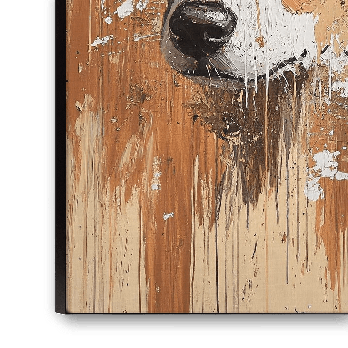Dieses dynamische Kunstwerk zeigt ein wunderschönes Porträt eines Hundes, lebendig wiedergegeben mit Farbspritzern und einem warmen Farbton. Die Mischung aus Braun-, Schwarz- und Weißtönen verleiht dem Gemälde einen kraftvollen, ausdrucksstarken Look, der ideal für moderne Innenräume ist. Das Design ist perfekt für Tier- und Kunstliebhaber, und die verspielten Farbspritzer verleihen dem Bild eine moderne und energiegeladene Note. Es passt perfekt in jeden Raum, sei es der Flur für einen auffälligen Empfang oder ein Schlafzimmer, um eine einzigartige Atmosphäre zu schaffen. Dieses Gemälde bringt Lebendigkeit und Charakter in Ihr Zuhause und zieht garantiert alle Blicke auf sich.