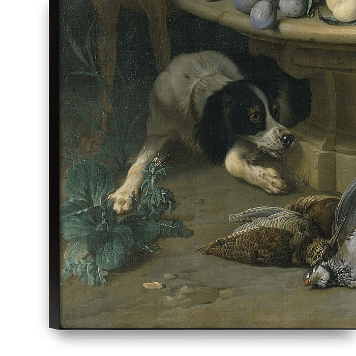 Bestelle Hunde, totes Wild und Früchte, Alexandre François Desportes als Reproduktion auf Leinwand, Alu-Dibond, als Poster, Fototapete oder Acrylglasbild.