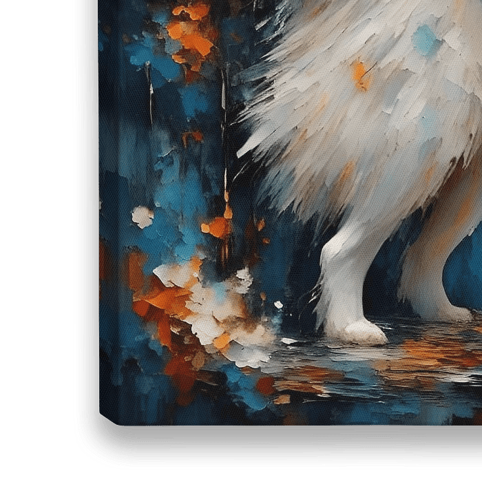 Ein majestätischer weißer Hund steht vor einem Hintergrund aus leuchtenden Herbstblättern und einer sanften blauen Umgebung. Das flauschige Fell des Hundes wird von den umgebenden Farben hervorgehoben, wodurch seine voluminöse Textur und die würdevolle Haltung des Tieres betont werden.