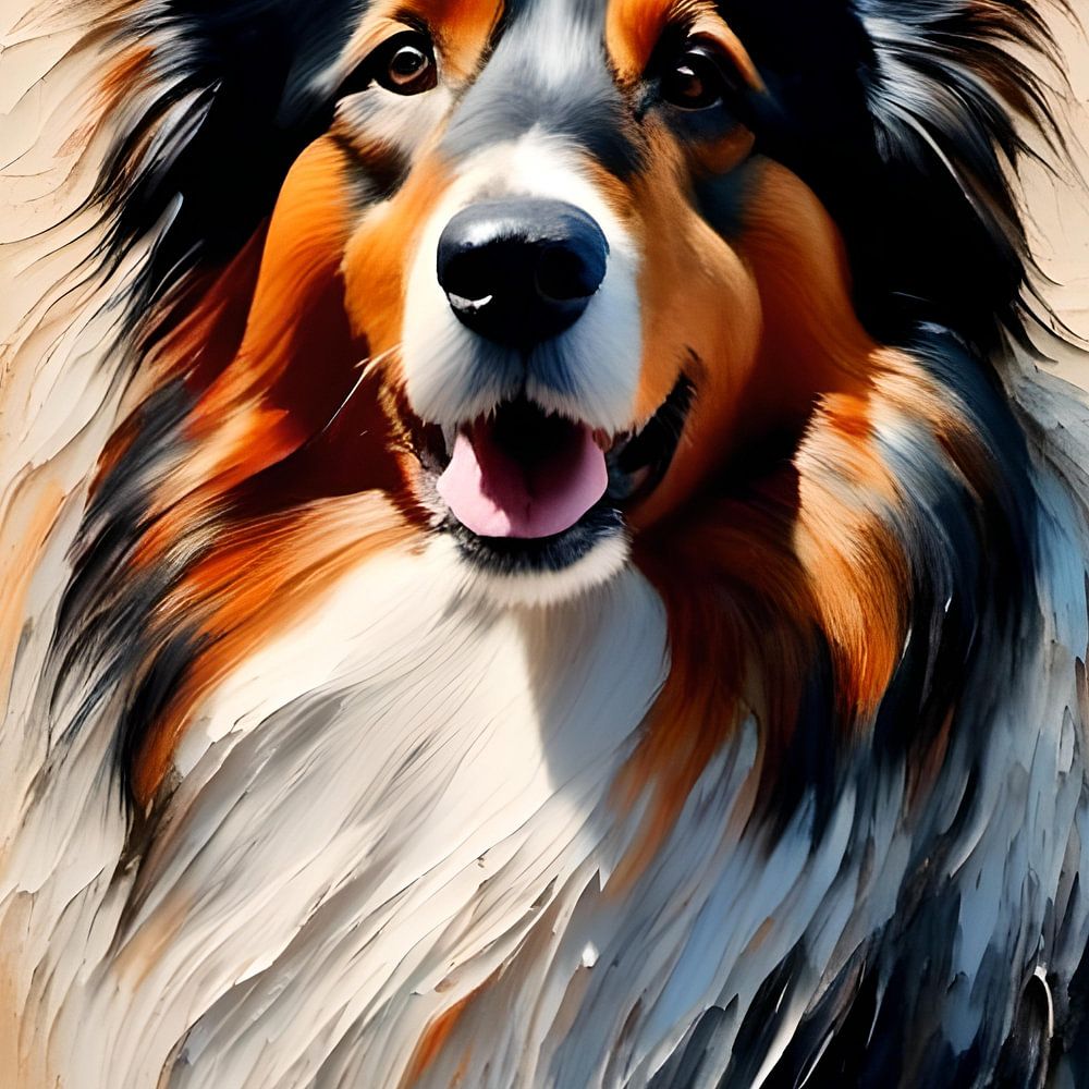 Ein lebhaftes Porträt zeigt einen Shetland Sheepdog, auch Sheltie genannt, mit einer auffälligen Farbmischung, die sein langes Fell hervorhebt. Der Hund steht vor einem Hintergrund mit orangefarbenen und blauen Farbtupfern, der den Eindruck einer lebendigen, dynamischen Umgebung vermittelt.